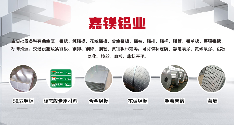 嘉鎂鋁業(上海)有限公司主要批發各種有色金屬:鋁板、純鋁板、 花紋鋁板、合金鋁板、鋁卷、鋁排、鋁棒、鋁管、鋁單板、幕墻鋁板、 標牌滑道、交通設施及紫銅板、銅排、銅棒、銅管、黃銅板帶箔等